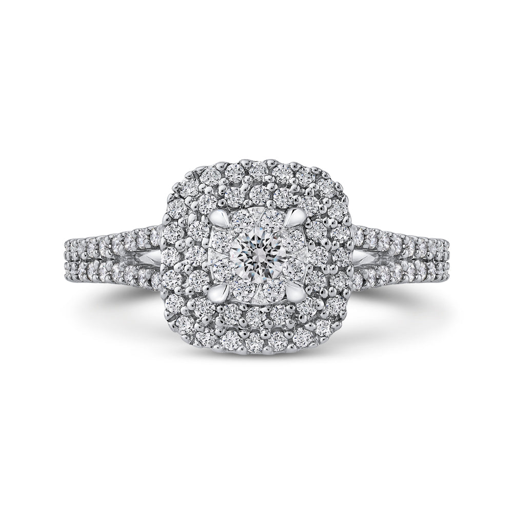 Classic and elegant, this diamond engagement ring will win her hand and her heart. A double halo frame of smaller round diamonds surrounds the center cluster, while additional diamonds line the slender shank.