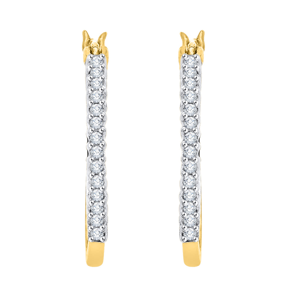 Twenty eight diamonds of 0.15 ct. (Tw.), coupled with 10k gold are prong set here in a classic yet romantic hoop earring. Great surprise gift item.