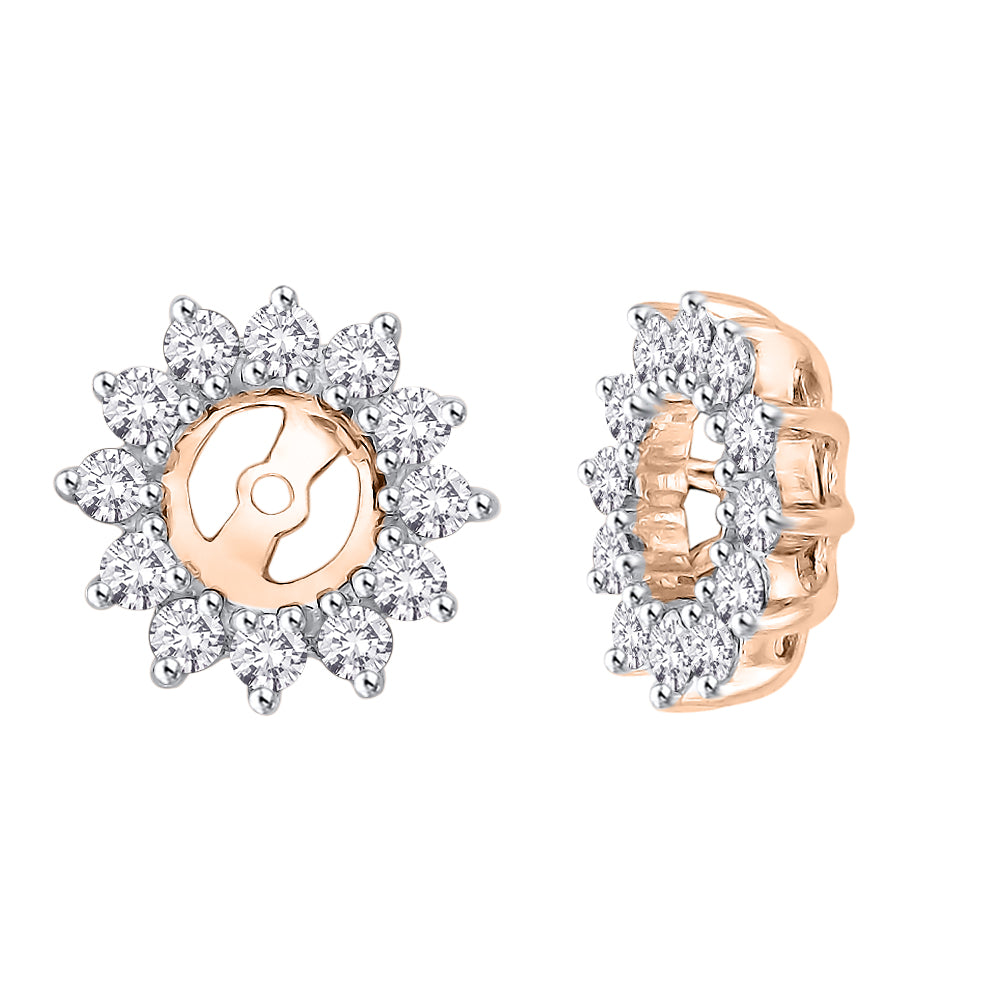 Add a whole new look to your simple stud earrings with these dazzling earring jackets. Simply slip your earring post through the hole, and your earring is instantly haloed by brilliant round cut diamonds set in gold. These pair of earring jackets can hold to 1 ct (Tw.) stud earrings. (Studs are not included) Outer diameter: 0.40 in and Inner diameter: 0.21 in.