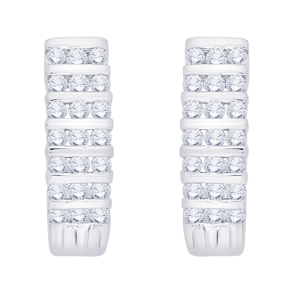 These fashionable hoop earrings are crafted of 14k,10k gold and sterling silver. The hoop earrings are accented by round cut diamonds that are channel set with a total diamond weight of 3/4 carats, the perfect accent for any special occasion.