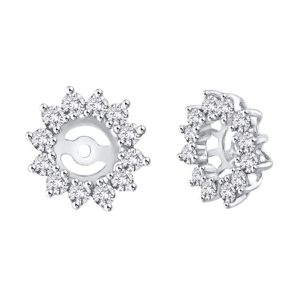 Add a whole new look to your simple stud earrings with these dazzling earring jackets. Simply slip your earring post through the hole, and your earring is instantly haloed by brilliant round cut diamonds set in gold. These pair of earring jackets can hold up to 2 ct. (Tw.) stud earrings. Studs are not included.