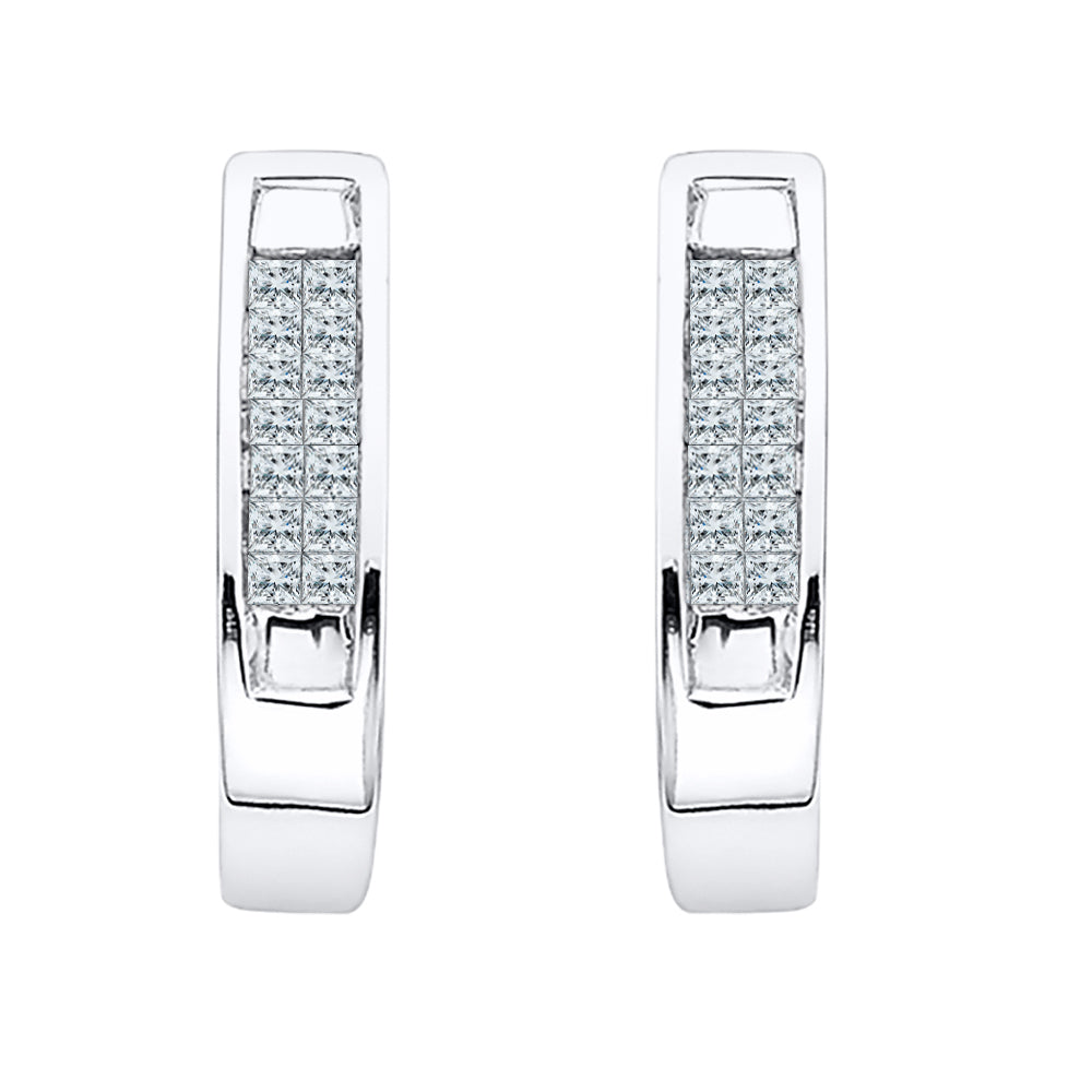 The epitome of sophistication, these invisible set diamond huggies radiate classic elegance. These twenty eight sparkling princess cut diamonds of 1/4 ct. (Tw.) are set in a gleaming lustrous of gold.