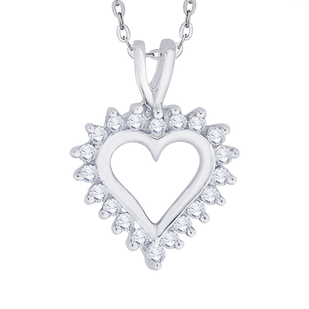 Show your love with this beautiful diamond heart pendant. This pendant showcases sparkling round-cut diamonds prong-set in highly polished 14k,10k gold and sterling silver. The heart shaped pendant hangs from a 18-inch chain with a spring ring clasp.