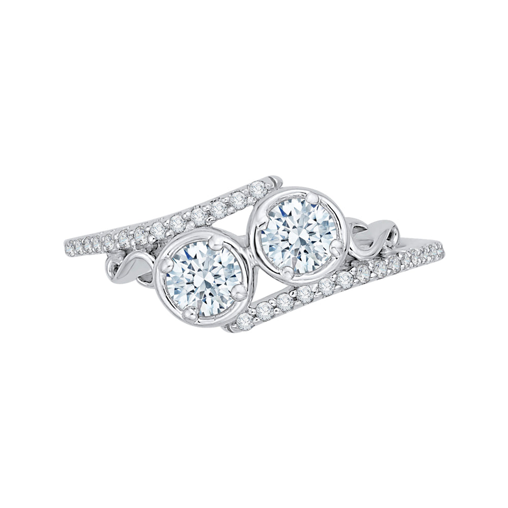 Two large diamonds are set side-by-side, with the band erupting from each diamond in a shower of smaller stones. Crafted of fine 14-karat white gold and shines with a high polish finished.