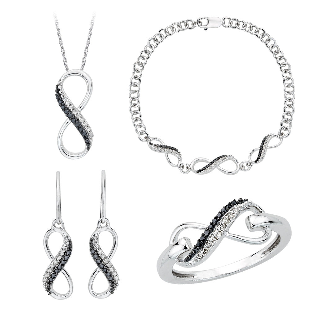Lend any ensemble classic elegance with this black and white diamond infinity jewelery set. The intricate design and shimmer of 10k white gold convey timeless sophistication. And at that price you cant resist it consists of pendant (0.06 ct.) with chain, ring (0.06 ct.), earrings (1/10 ct.) and bracelet in (1/5 ct.)