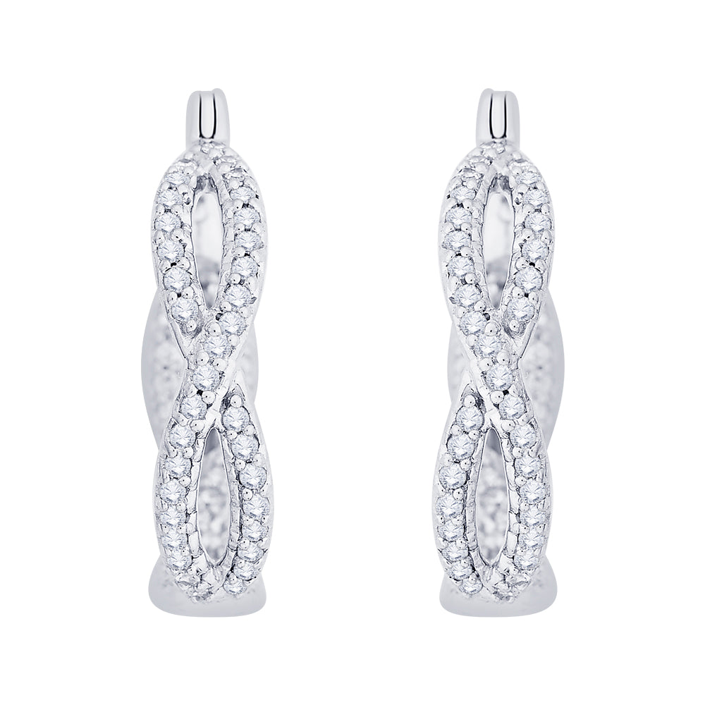 These infinity diamond hoop earrings are delicate and perfect for day to evening wear. The earrings are embellished with intricate infinity shaped detailing throughout. Secured with hinge notched post.