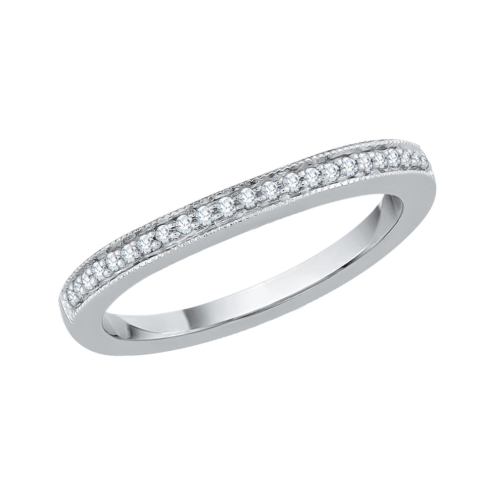Sweet and unique, this stylish curved wedding band will add delicate sparkle to your look. The lovely band is crafted in gleaming gold and sterling silver, and features a row of shimmering 0.12 cttw diamonds. The lovely band shines with a high polish finish.