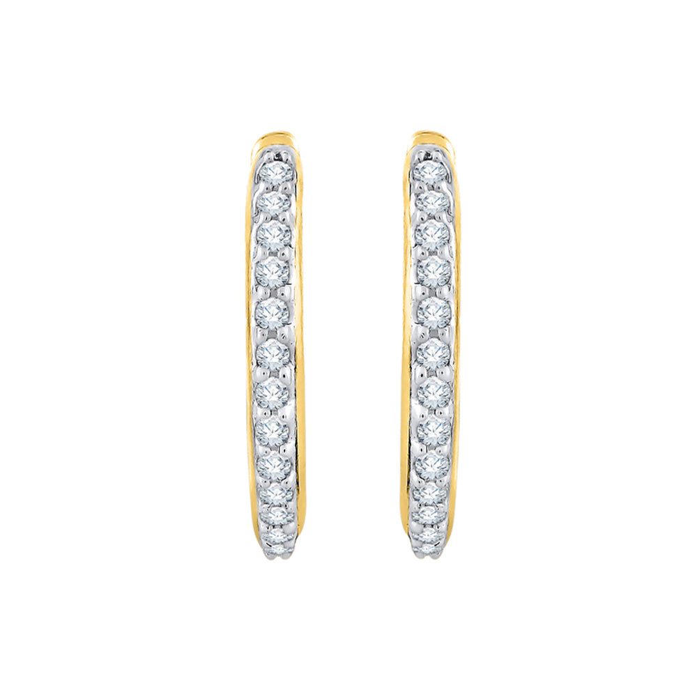 Brighten up your look with the entrancing twinkle of these diamond hoop earrings. These earring features 42 sparkling brilliant round-cut diamonds set inside and outside along highly polished 14k gold. Wear them to reflect the sunshine or the moonlight, as they are perfect for any occasion.